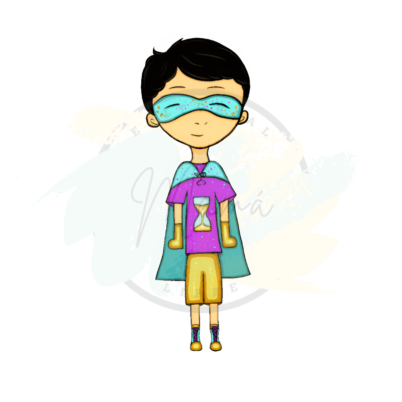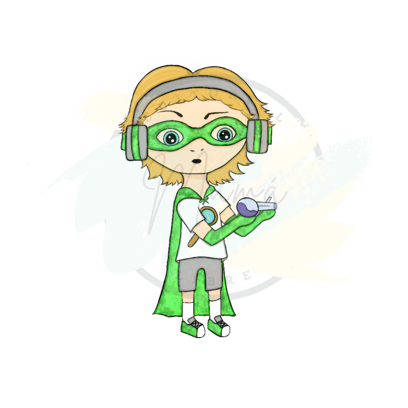 Super Curioso: Este personaje ama la ciencia y el aprendizaje. Está siempre investigando y resolviendo misterios, alentando a los niños a explorar el mundo. Lleva auriculares de concentración, para evadir el ruido del entorno, es un superhéroe con autismo.