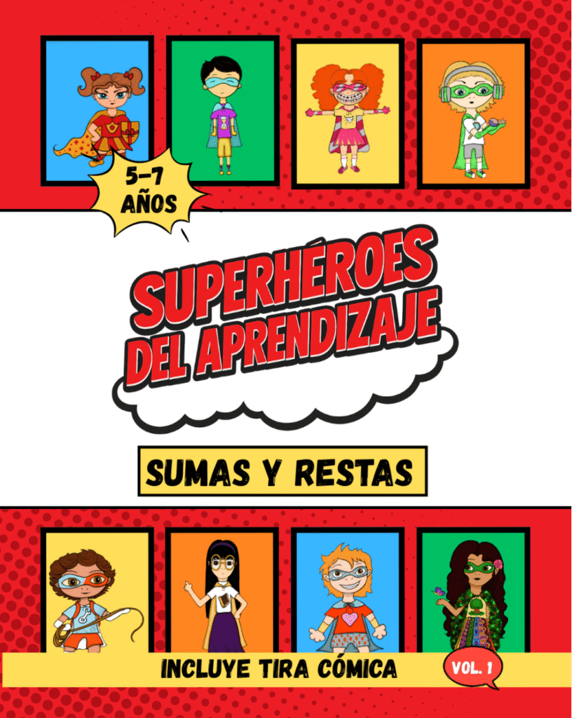 Sumas y restas con los Superhéroes del Aprendizaje. Disponible en todos los mercados de Amazon. A color, con aprendizaje progresivo y con tira cómica incluida. ¡Suma diversión, resta aburrimiento y multiplica imaginación! ¡Haz clic aquí para empezar la aventura!